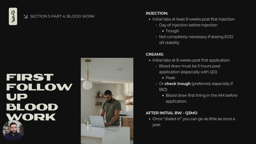 Get a clear understanding of follow-up protocols for testosterone therapy, including when to check labs, how to interpret results for injections vs. creams, and the importance of ongoing monitoring to ensure optimal patient outcomes.